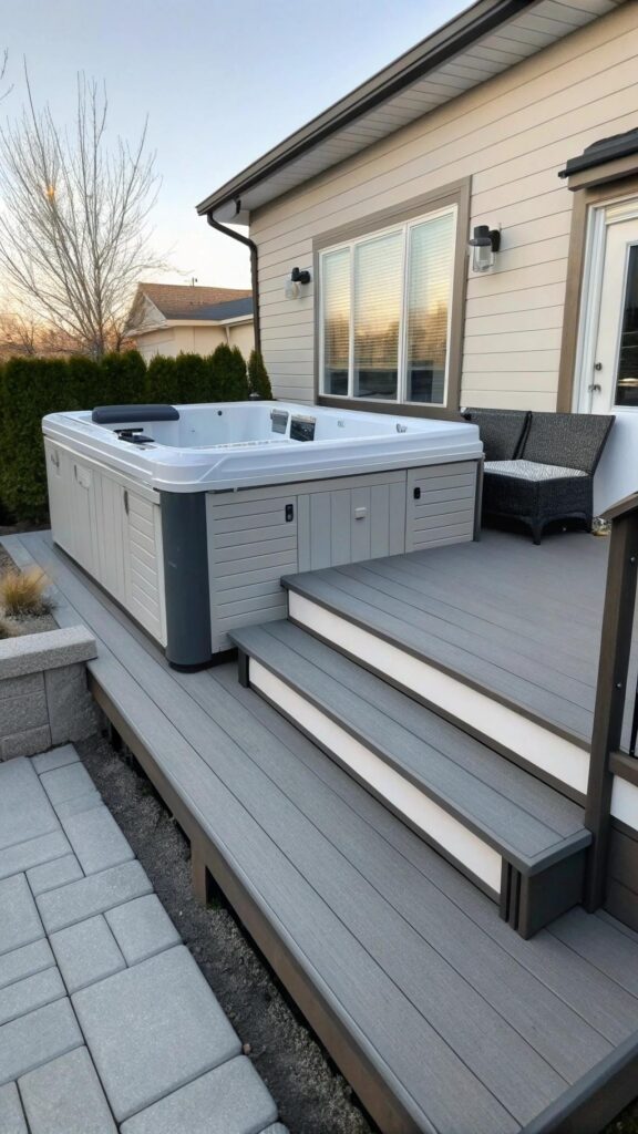 Consider benches with built-in storage around the hot tub area. These provide seating and keep clutter out of sight.