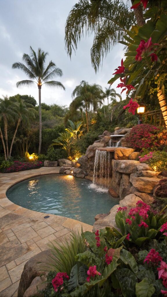 Imagine a backyard transformed into a tropical haven. Palm trees sway gently, and vibrant hibiscus flowers bloom. This design creates an exotic escape right at home.