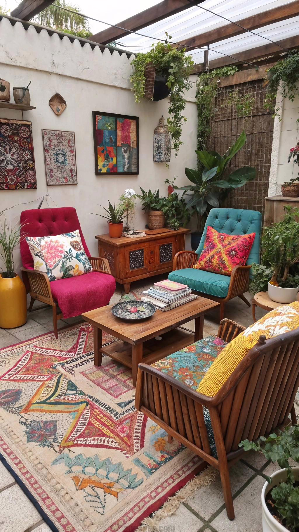A bohemian chic patio is all about vibrant colors and eclectic decor. Use mismatched furniture, colorful rugs, and patterned cushions. Add macrame hangings, lanterns, and plants for a boho vibe.