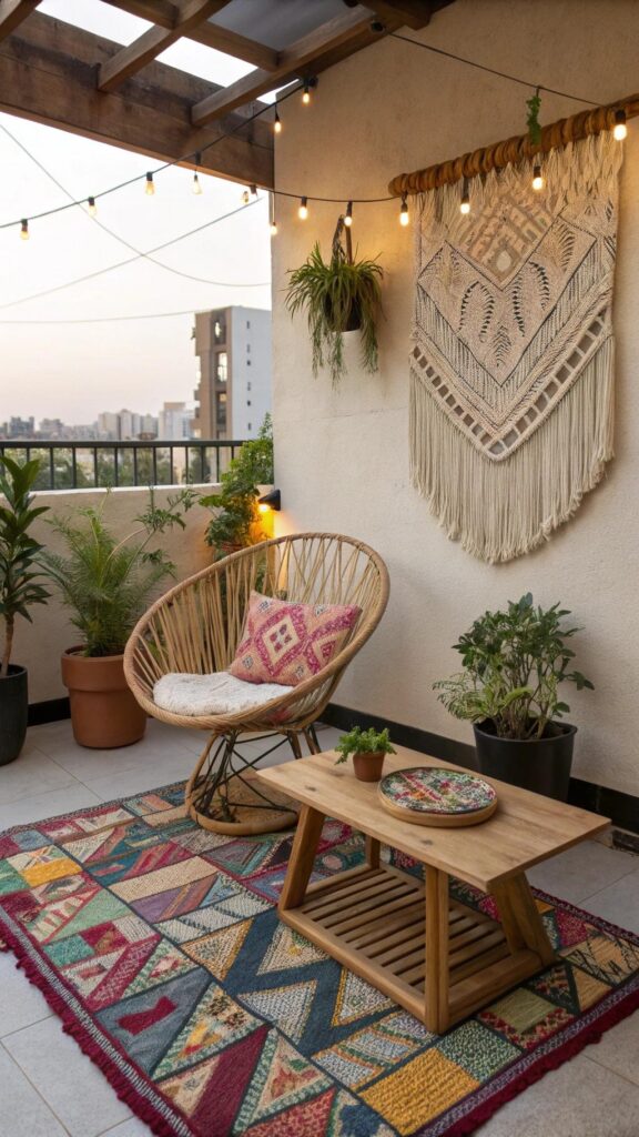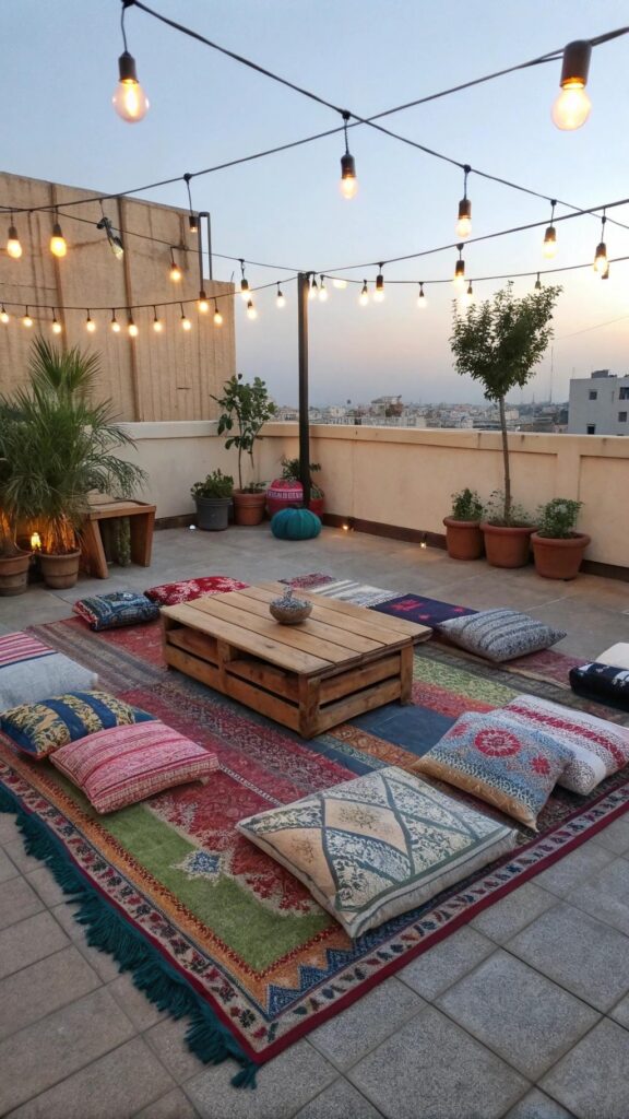 A rooftop patio with a bohemian vibe is perfect for urban homes. Use colorful rugs, floor cushions, and low tables. Add string lights, lanterns, and plants for a cozy feel.