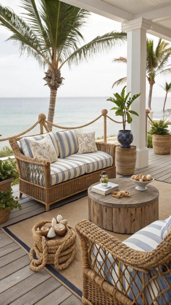 Add nautical decor like rope accents, seashells, and striped cushions. Use plants like palms and succulents for a beachy feel. This design is perfect for creating a relaxing retreat.