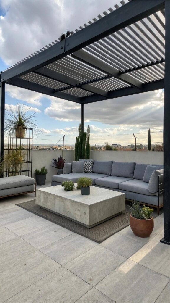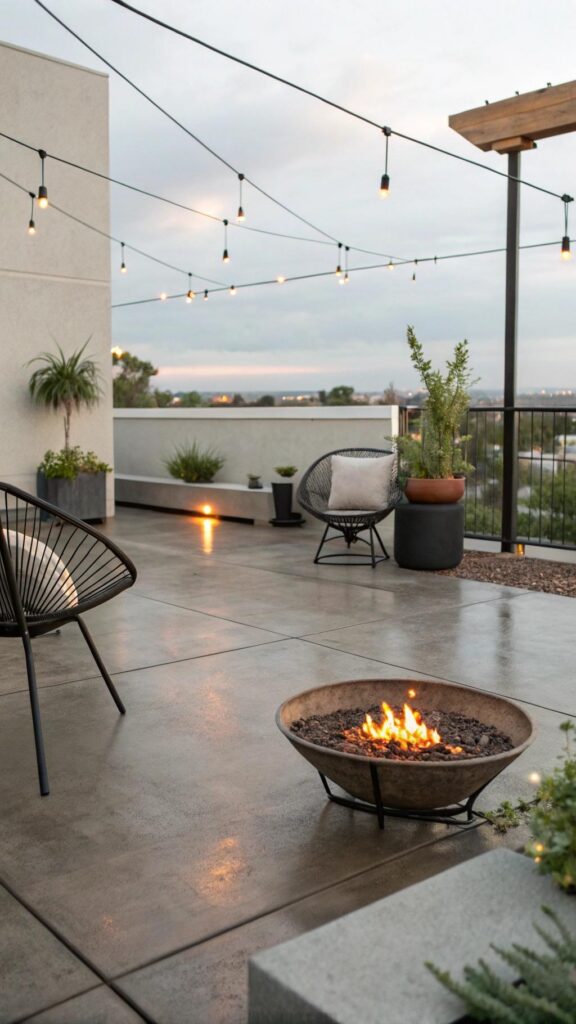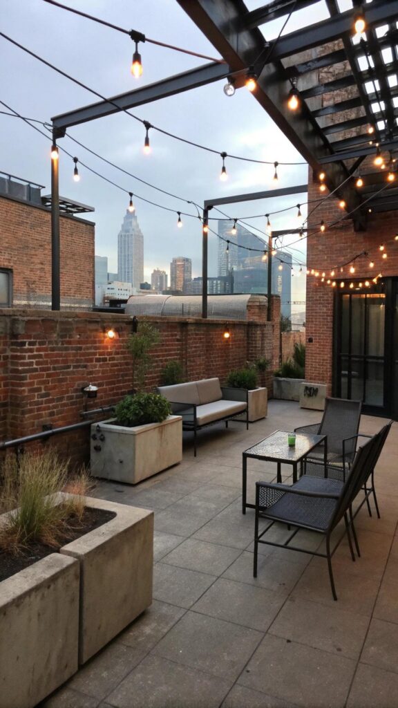 An industrial rooftop patio uses raw materials for an edgy look. Use metal furniture, concrete planters, and exposed brick walls. Add Edison bulb string lights for a vintage vibe.