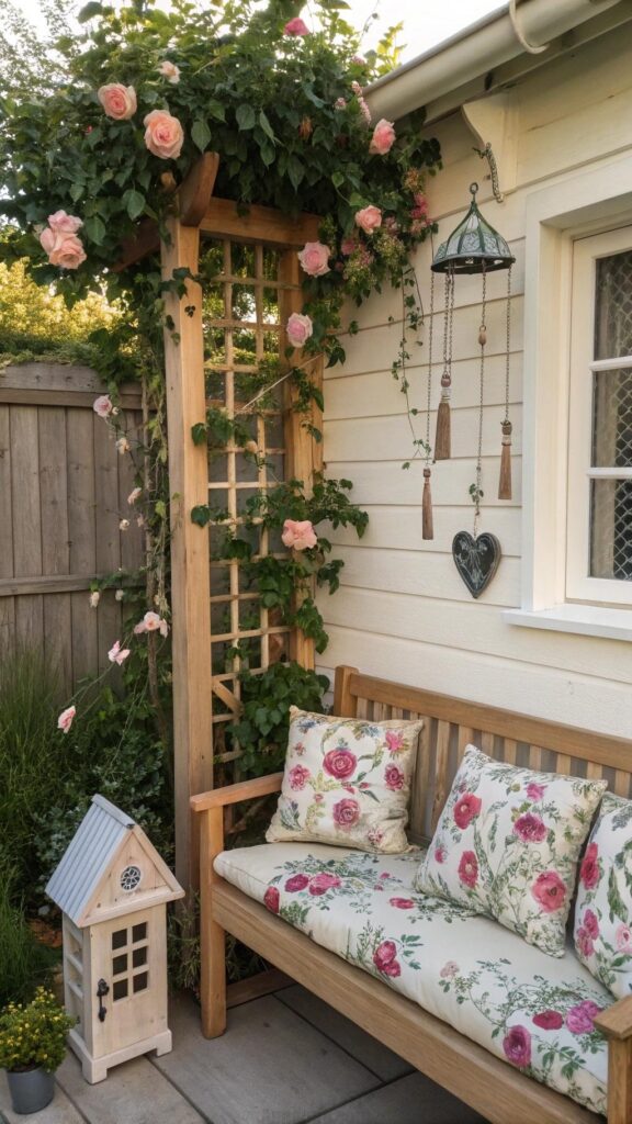 A cottage-style patio exudes charm and warmth. Use vintage furniture, floral cushions, and wooden accents. Add a trellis with climbing roses or ivy for a romantic touch.