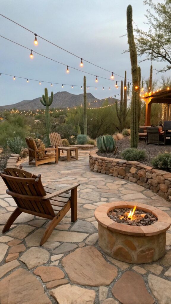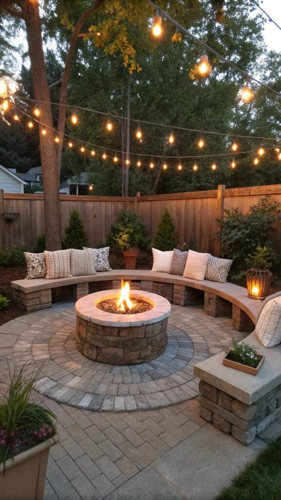 A fire pit patio adds warmth and ambiance to your backyard. Surround the fire pit with comfortable seating like Adirondack chairs or built-in stone benches. Use weather-resistant cushions and blankets to make the space inviting.