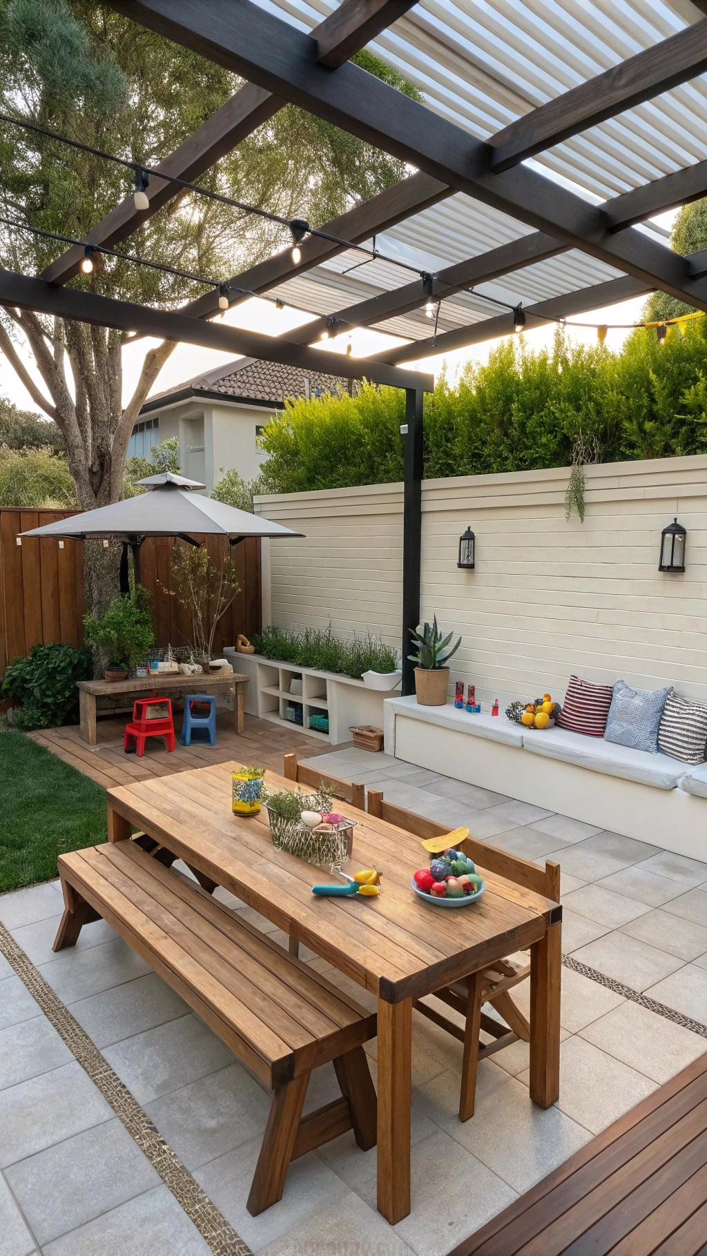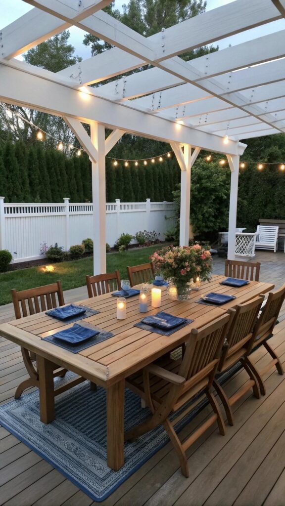 Decorate the table with colorful placemats, candles, and fresh flowers. Install outdoor lighting like pendant lights or lanterns for evening dinners. This design is both functional and stylish.