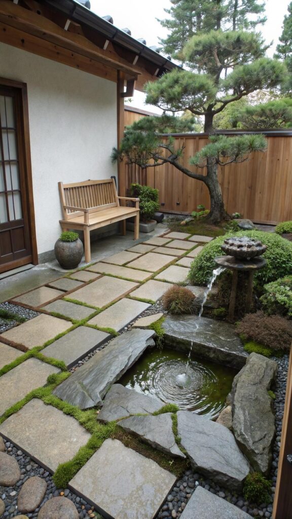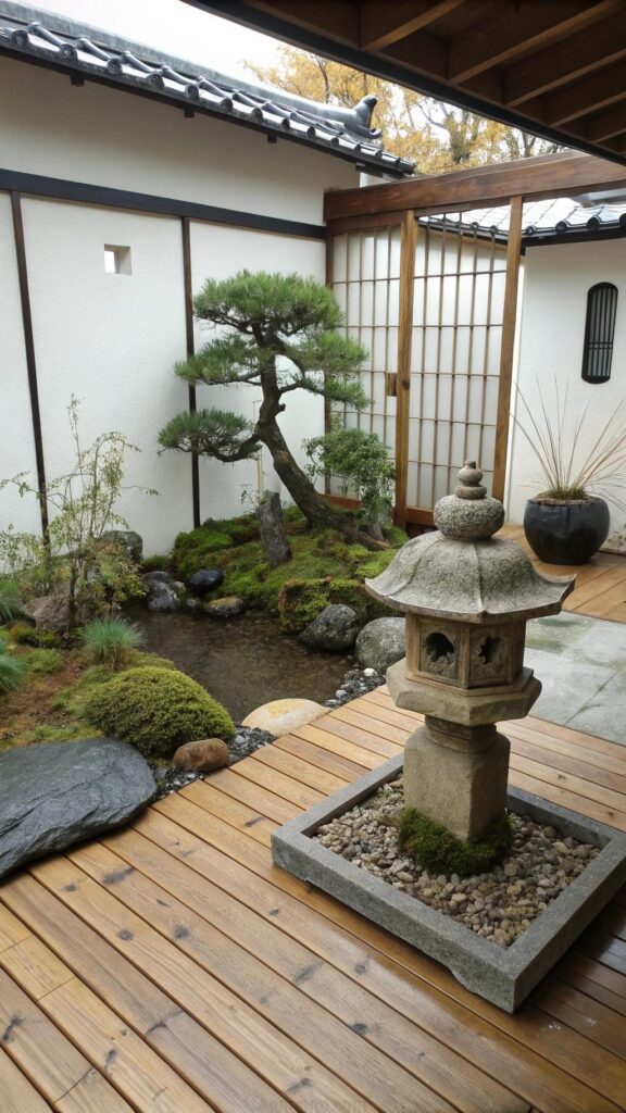 A minimalist Japanese patio focuses on simplicity and nature. Use natural materials like wood, stone, and bamboo. Add a small water feature and minimalist decor like a stone lantern.