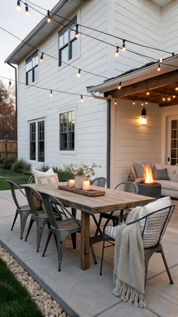 A modern farmhouse patio combines rustic and contemporary elements. Use wooden furniture with clean lines and neutral colors. Add metal accents like a fire pit or lanterns.