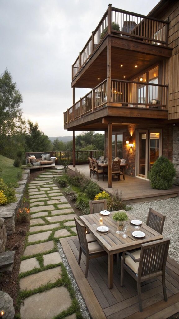 Choose materials like wood, stone, or concrete for each level. Add plants and lighting to enhance the design. This layout is ideal for larger backyards with varied terrain.