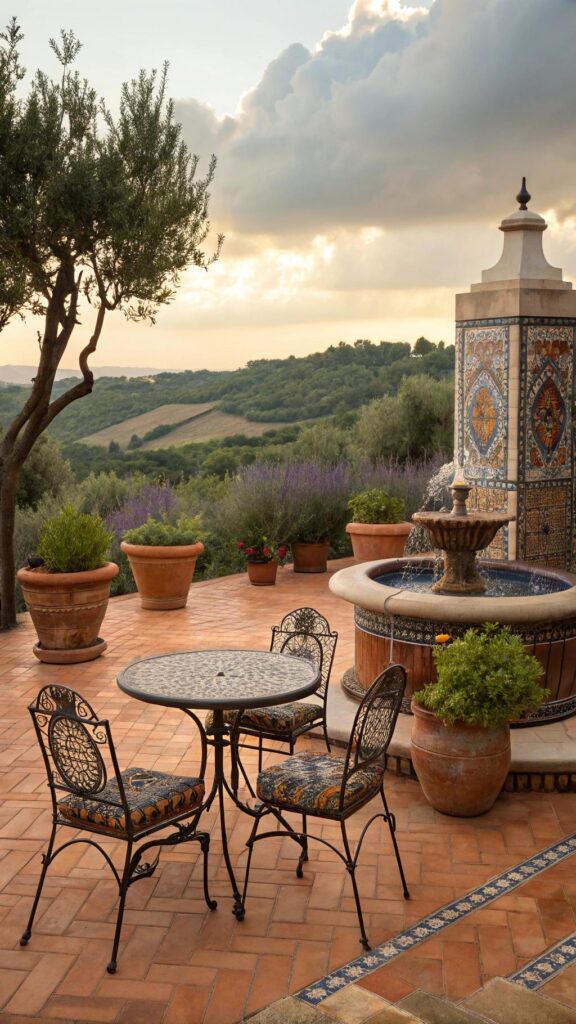A Mediterranean-inspired patio features warm colors and natural materials. Use terracotta tiles, wrought iron furniture, and colorful mosaic accents. Add potted olive trees or lavender for a touch of the Mediterranean.