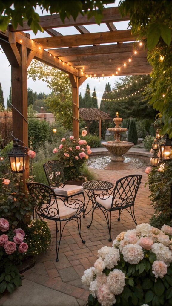 A romantic garden patio uses soft colors and lush plants for a dreamy vibe. Use wrought iron furniture, floral cushions, and a wooden arbor. Add a water feature like a fountain or pond.