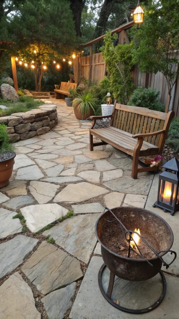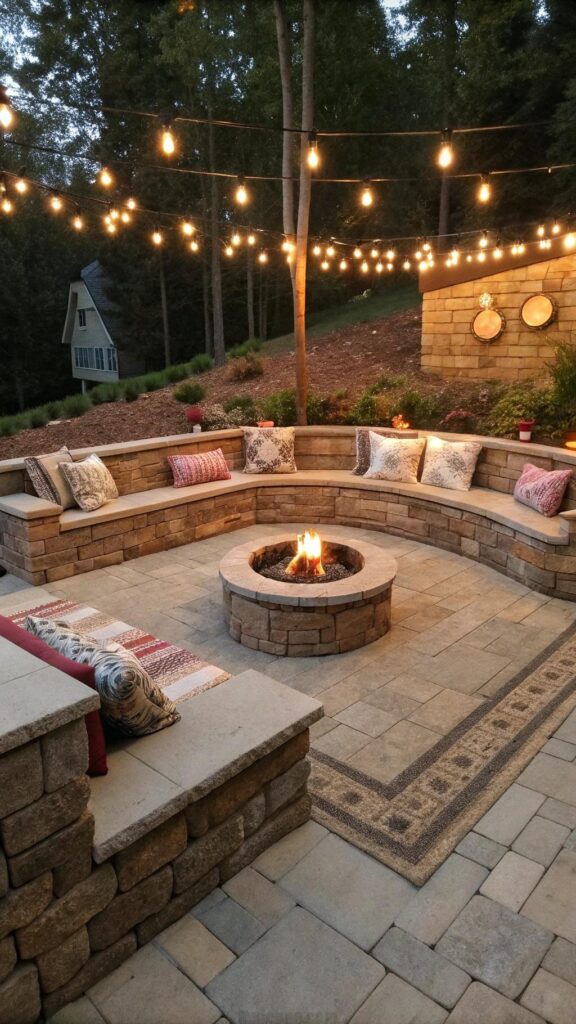 Add string lights or lanterns for a magical evening vibe. Choose materials like natural stone or brick to match your home’s exterior. A fire pit patio is perfect for gatherings or quiet nights under the stars.
