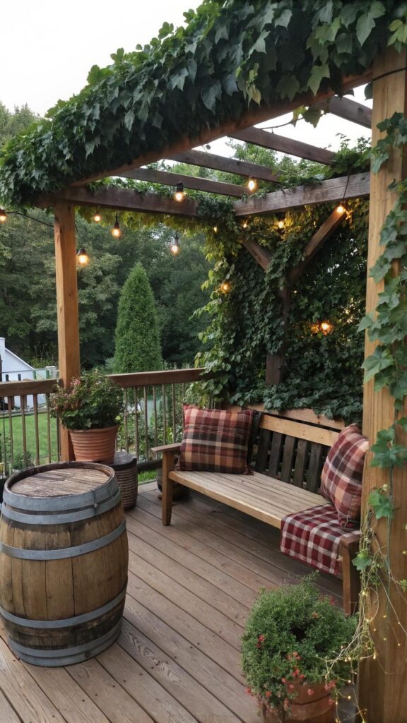 A rustic wooden deck patio brings natural charm to your backyard. Use reclaimed wood for the deck and furniture to create an eco-friendly space. Add a wooden pergola with climbing vines for shade and character.