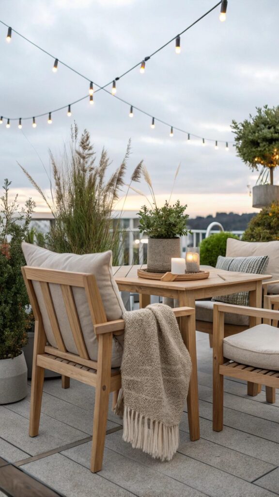 A Scandinavian-inspired patio focuses on simplicity and functionality. Use light-colored wood, neutral tones, and minimalist decor. Add cozy textiles like wool blankets and cushions.