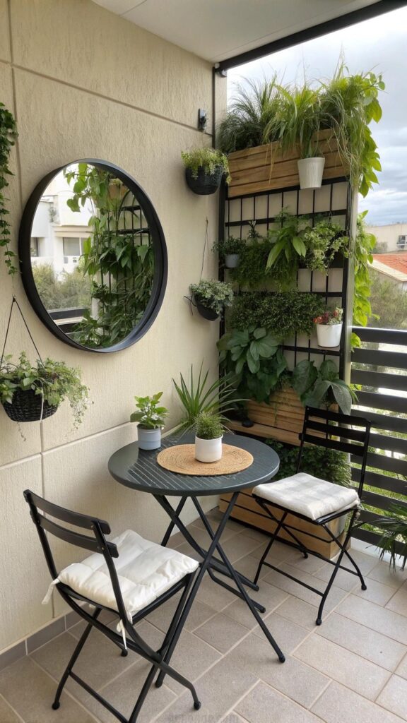 Use foldable furniture, vertical gardens, and light colors to maximize space. A bistro set or built-in benches work well.