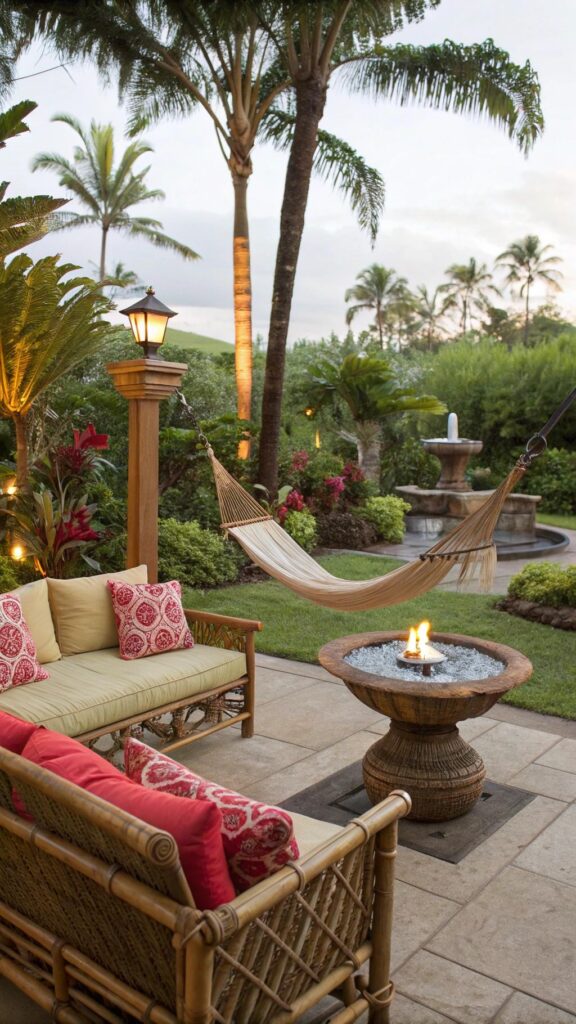 Incorporate palm trees, ferns, and flowering plants for a lush look. Hang a hammock or add a swing chair for the ultimate relaxation spot. This design brings vacation vibes to your backyard.