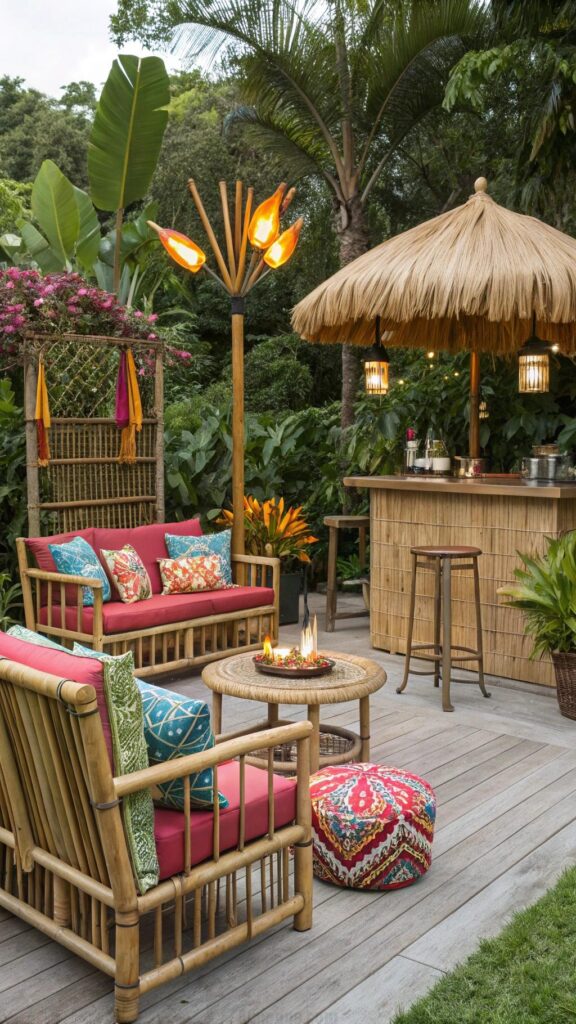 A tropical tiki patio is perfect for a fun and festive vibe. Use bamboo furniture, thatched umbrellas, and tiki torches. Add colorful cushions and decor like seashells or coconuts.
