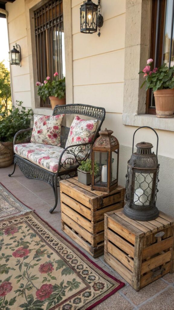 A vintage-inspired patio uses antique furniture and decor for a nostalgic feel. Use wrought iron furniture, wooden crates, and vintage lanterns. Add floral cushions and patterned rugs.