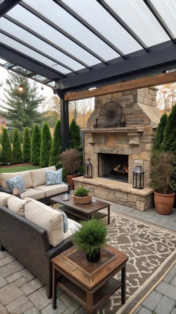 An all-season patio allows you to enjoy your backyard year-round. Use a pergola or gazebo with retractable covers or screens. Add a fireplace or outdoor heater for colder months.