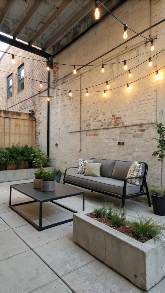 An industrial-style patio features raw materials like metal, concrete, and brick. Use metal furniture, concrete planters, and exposed brick walls for an edgy look. Add Edison bulb string lights for a vintage industrial vibe.