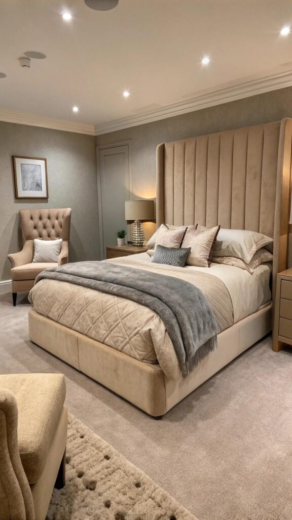 Design a bedroom focused on plush comfort using soft textures. Combine beige and grey in materials that feel luxurious. This creates an ultimate relaxation zone.