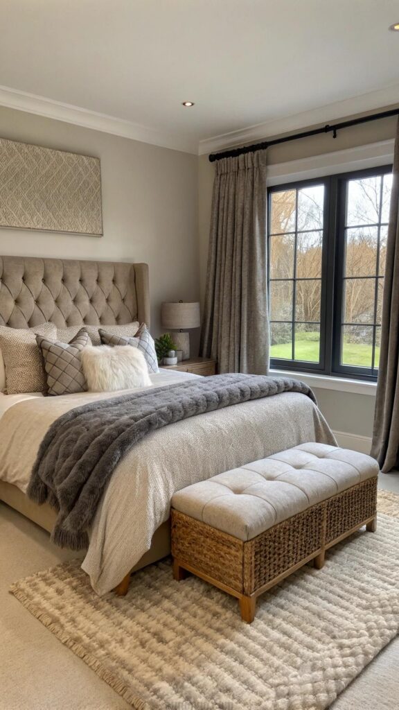 Mix different fabrics like chunky knits, smooth linen, soft velvet, and faux fur. Use these textures in bedding, rugs, curtains, and upholstery. Keep the color palette focused on beige and grey shades.