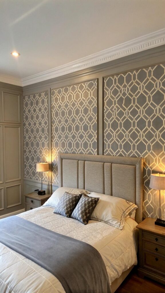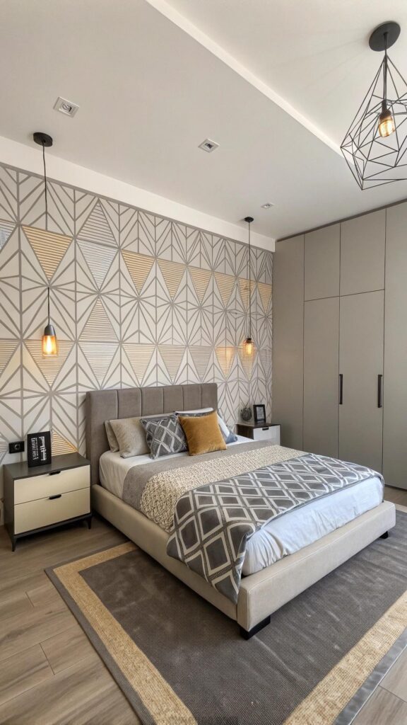 A bold geometric wallpaper or a textured grey panel behind the bed works well. Alternatively, paint a feature wall in a contrasting shade or design. Keep other walls and furnishings relatively simple.