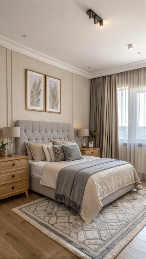 Contrast warm beige with cool grey for a balanced bedroom. This combination creates a dynamic yet harmonious feel. The interplay between warm and cool tones adds interest.