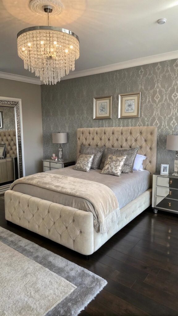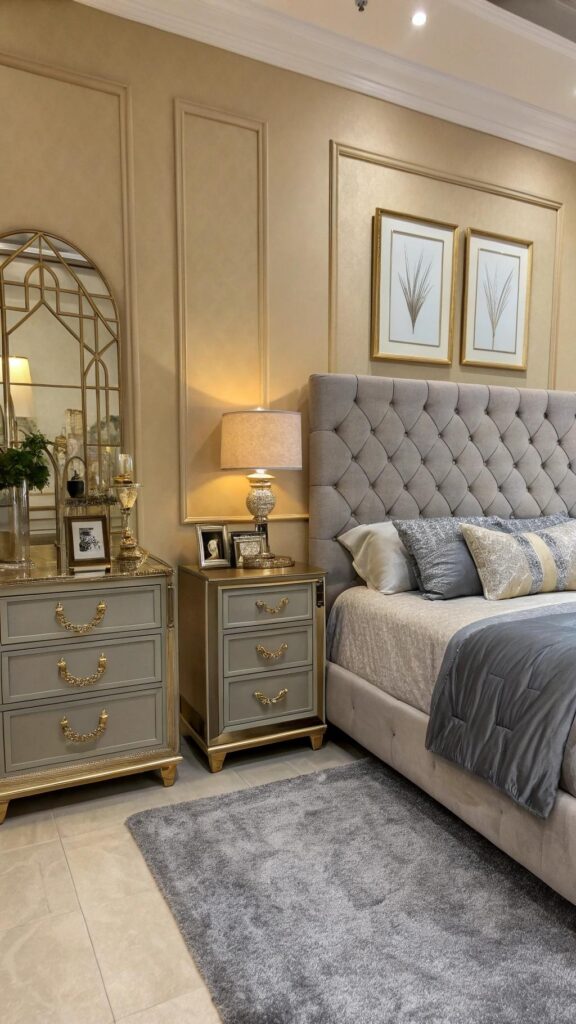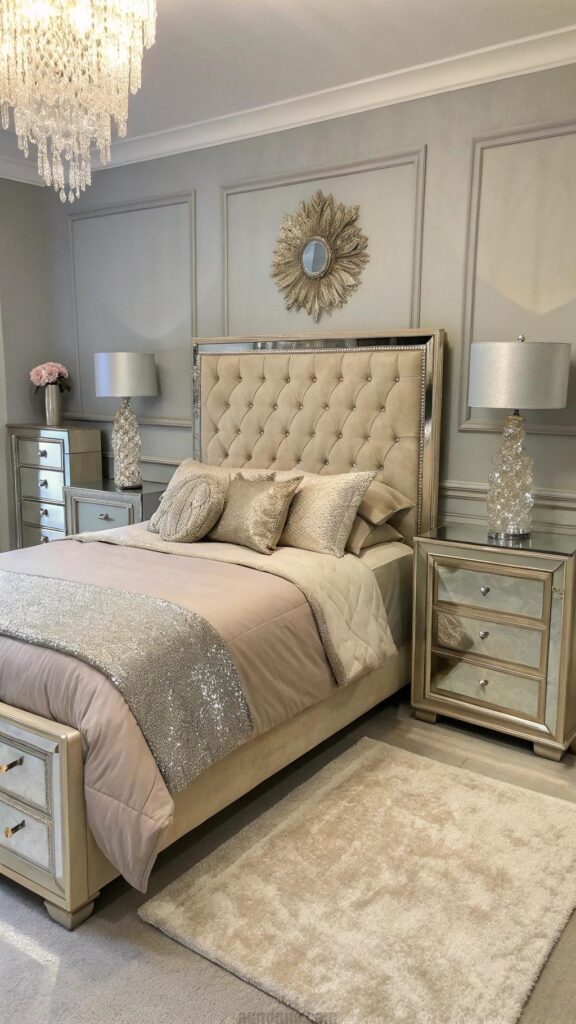 The bedroom gains a sophisticated, slightly Hollywood-regency feel. It balances the neutrality of beige and grey with reflective shine. This adds a touch of luxury effortlessly.