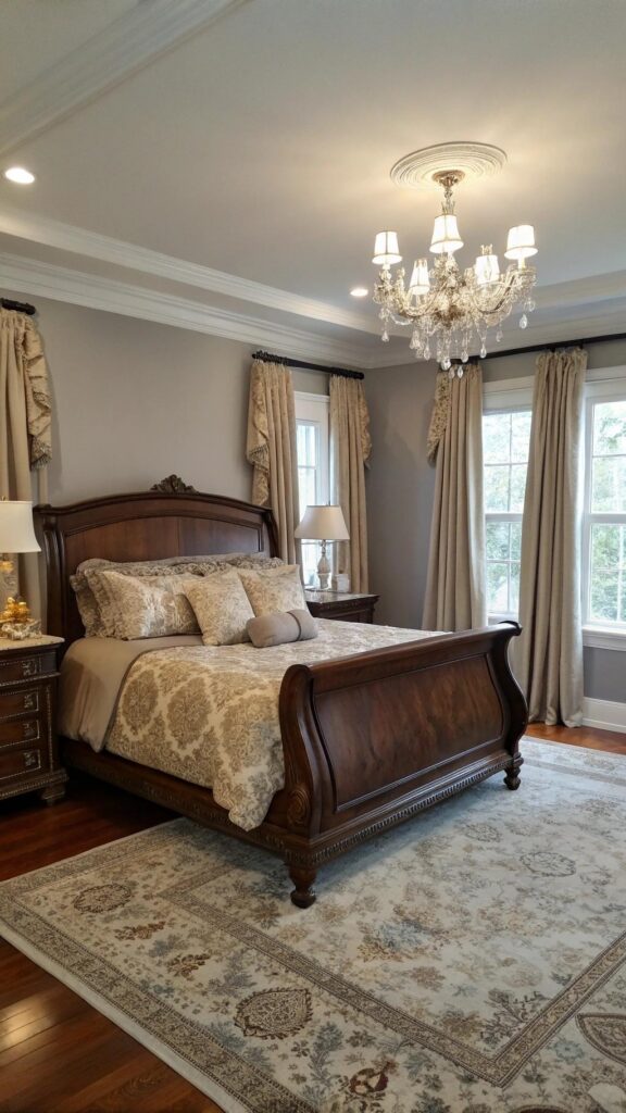 Choose furniture with classic lines, like a sleigh bed or pieces with ornate details. Use luxurious fabrics such as damask or silk for bedding and curtains. Incorporate traditional patterns in rugs or upholstery.