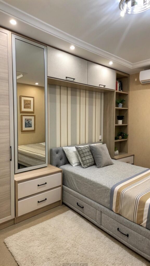 Optimize a small bedroom using smart beige and grey solutions. Light neutrals help small spaces feel larger. Clever design maximizes functionality.