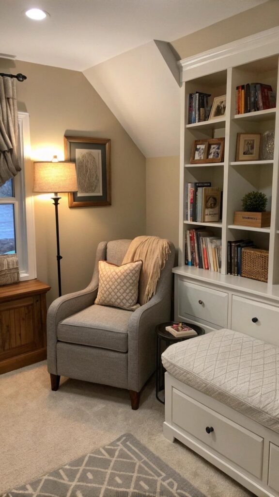 Designate a corner with a comfortable armchair, perhaps in grey upholstery. Add a small side table, good lighting, and maybe some bookshelves. Use beige throws or cushions for comfort.