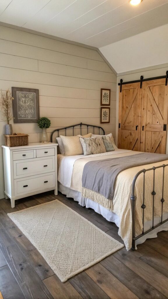 Incorporate elements like shiplap walls (painted beige or grey) or a sliding barn door. Use vintage-style metal bed frames or distressed wood furniture. Combine these with simple, comfortable textiles in beige and grey.
