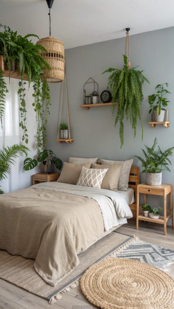 Place various potted plants on shelves, nightstands, or hang them. Choose plants that thrive indoors and complement the room’s light levels. Use simple beige or grey pots.