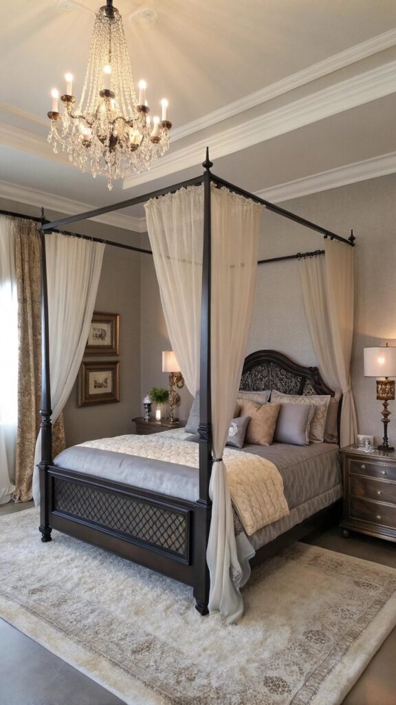 Drape the canopy frame with sheer beige or light grey fabric. Coordinate bedding in complementary beige and grey tones. Choose elegant lighting and side tables to match the bed’s style.