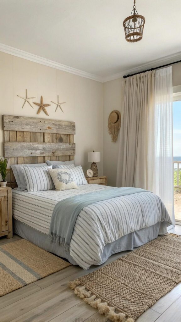 Use light sandy beige on walls and incorporate weathered wood furniture. Layer light grey and white bedding for a fresh look. Add subtle coastal accents like driftwood or shells.