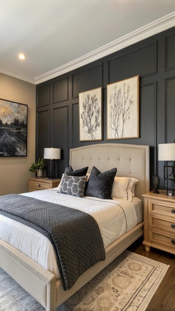 Paint one wall charcoal grey or use dark grey bedding elements. Incorporate dark grey in furniture pieces, artwork, or accessories. Balance the dark tones with plenty of light beige.