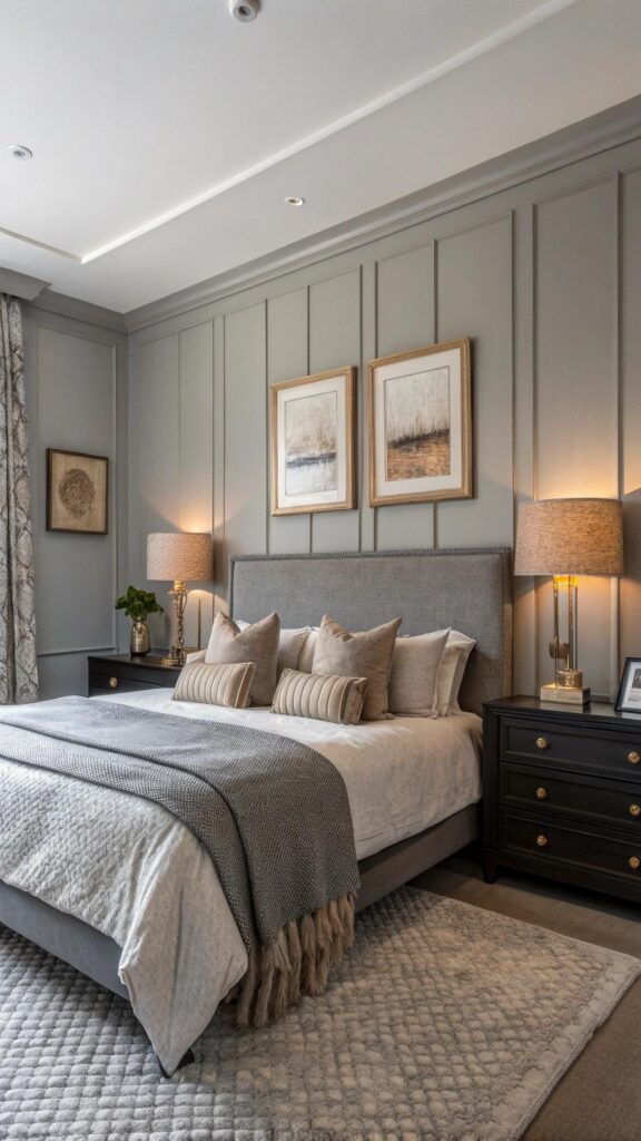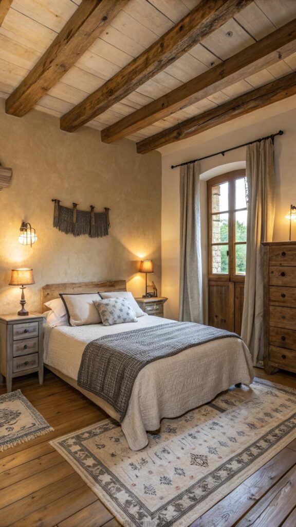 Incorporate rustic charm using warm wood accents. Combine beige and grey with natural wood textures. This creates a cozy and inviting bedroom.