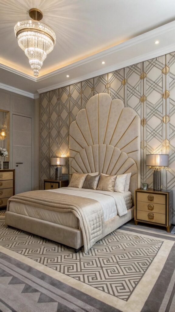 Use wallpaper with characteristic Art Deco patterns in beige, grey, and metallic hues. Select furniture with sleek lines, rich woods, and perhaps mirrored or lacquered finishes. Lighting should be stylized and make a statement.