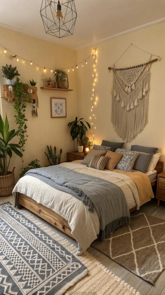 Create a relaxed bohemian blend using beige and grey. This style is eclectic, textured, and free-spirited. It mixes patterns and natural elements effortlessly.