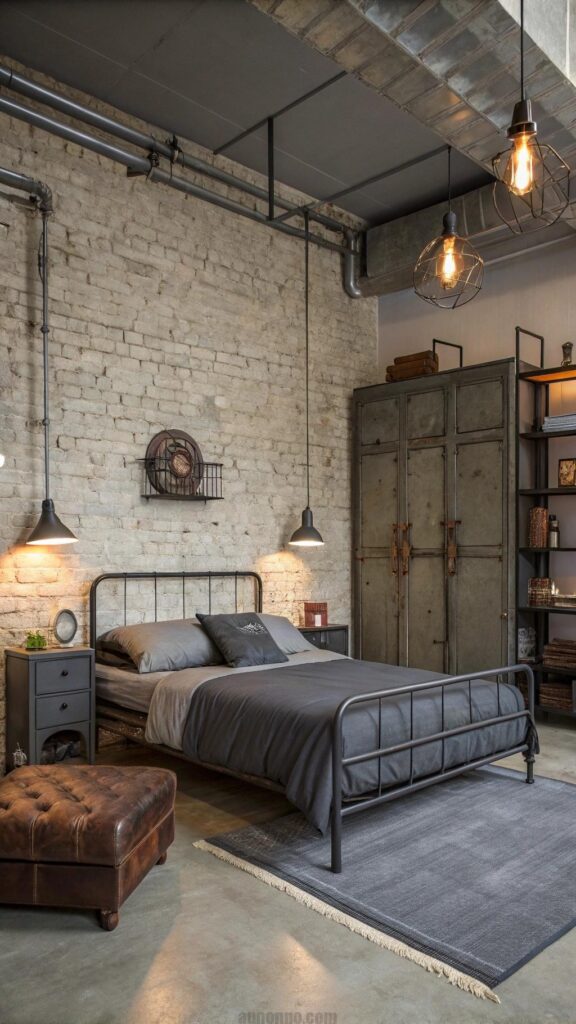 Feature an exposed brick wall painted grey or leave concrete floors bare. Use metal bed frames, pipe shelving, and vintage-inspired lighting. Contrast these with beige bedding or rugs.