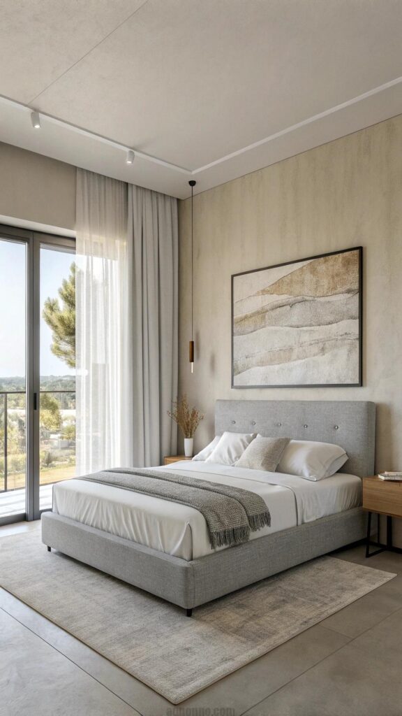 Maximize natural light in a beige and grey bedroom. Light colors enhance brightness and spaciousness. This design creates an airy, uplifting environment.