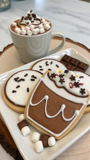 Capture the essence of winter with hot cocoa cookies. Use a mug-shaped cookie cutter and decorate with brown icing to represent hot chocolate. Add white icing for whipped cream and top with mini marshmallows or chocolate sprinkles. These cookies are perfect for pairing with a warm cup of cocoa.