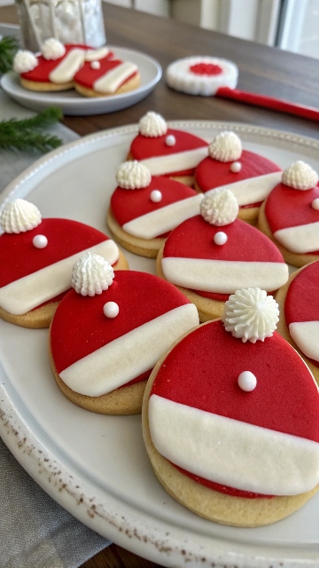Create festive Santa hat cookies by using a round cookie base and decorating it with red icing for the hat. Add a white icing band and a fluffy white pom-pom at the tip. These cookies are not only cute but also delicious, making them a perfect addition to your holiday cookie platter.
