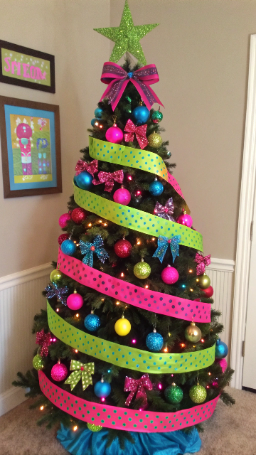 Bring back the fun of the 80s with a retro-themed Christmas tree. Use bright, bold ribbons in neon colors like hot pink, electric blue, and lime green. Start by wrapping the tree with a wide neon ribbon, allowing it to cascade down. Incorporate smaller ribbons in fun patterns like polka dots or stripes to create bows and accents.