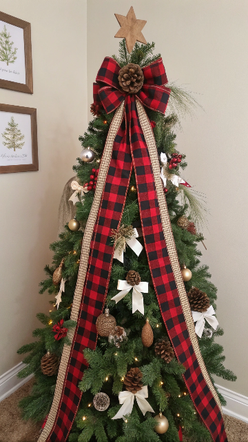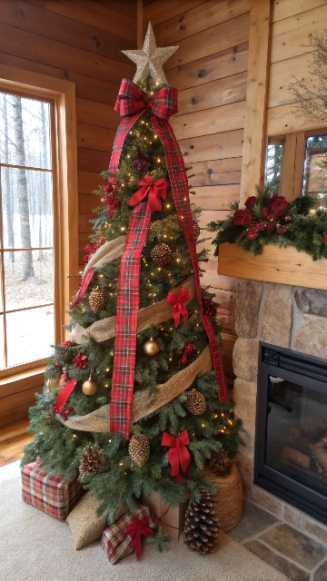 Bring the warmth of a cozy cabin into your holiday decor with a cabin retreat theme. Use ribbons in warm colors like deep red, forest green, and brown. Start by wrapping the tree with a wide red ribbon, allowing it to cascade down. Incorporate smaller ribbons in plaid or burlap for bows and accents throughout the tree.