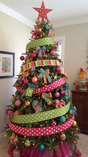 Incorporate colorful ornaments, such as bright red, blue, and yellow, to complement the ribbons. You can also add fun elements like candy canes or playful figurines to enhance the festive vibe. A whimsical tree topper, like a colorful star or a playful character, will complete this lively look.