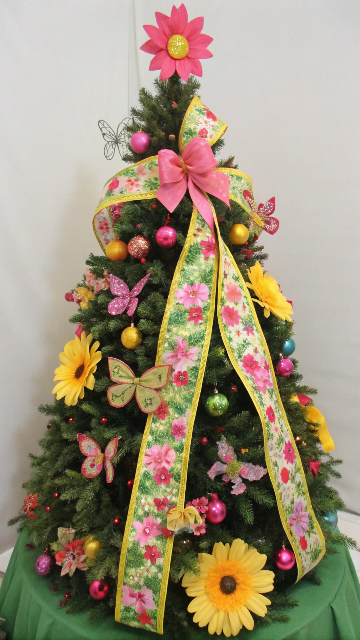 Create a vibrant and lively garden theme for your Christmas tree. Use ribbons in bright floral patterns and colors like pink, yellow, and green. Start with a green tree and wrap it with a wide floral ribbon, allowing it to cascade down. Incorporate smaller ribbons in solid colors that complement the floral patterns for bows and accents.