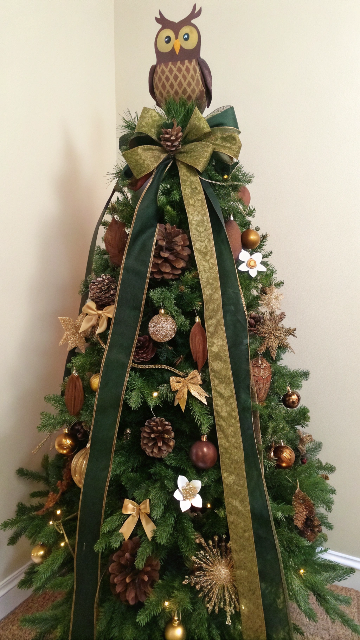 Create an enchanted forest theme by using deep greens, rich browns, and hints of gold. Start with a lush green tree and wrap it with a wide, dark green ribbon, allowing it to cascade down the branches. Incorporate smaller ribbons in gold or brown to create bows and accents throughout the tree.