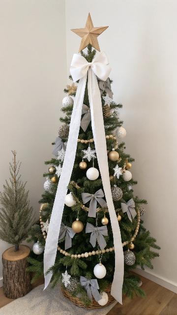 For a clean and modern aesthetic, consider a minimalist Scandinavian theme. Use ribbons in neutral colors like white, gray, and natural tones. Start with a green tree and wrap it with a wide white ribbon, allowing it to cascade down. Incorporate smaller ribbons in gray or beige for bows and accents.