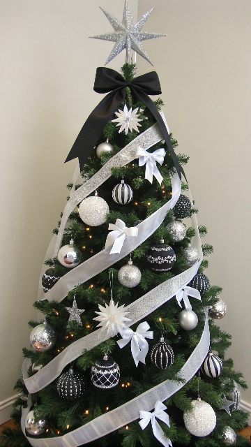 For a sophisticated and modern look, consider an elegant black and white theme. Start with a green tree and wrap it with a wide black ribbon, allowing it to cascade down. Incorporate white ribbons to create bows and accents throughout the tree, adding a touch of contrast and elegance.